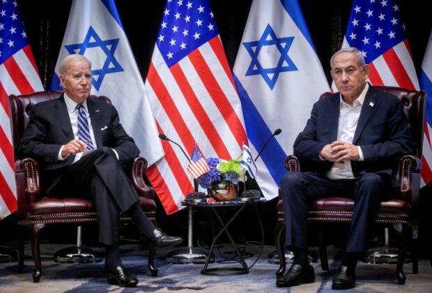 © Reuters. FILE PHOTO: U.S. President Joe Biden, left, pauses during a meeting with Israeli Prime Minister Benjamin Netanyahu, right, ...