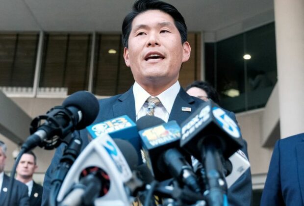 © Reuters. FILE PHOTO: Then-U.S. Attorney Robert Hur speaks to the media outside of the U.S. District Court, in Baltimore, ...