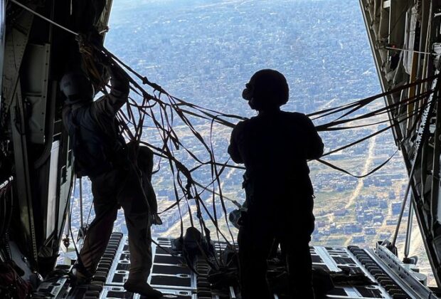 5/5 © Reuters. U.S. military personnel air drop aid parcels over Gaza, March 12, 2024. REUTERS/Jehad Shelbak 2/5 By Suleiman ...