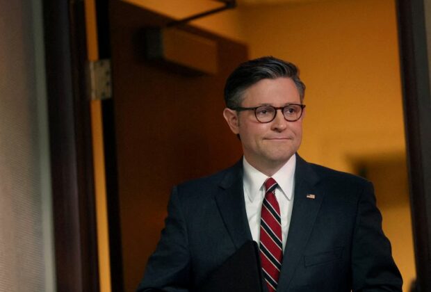 © Reuters. FILE PHOTO: U.S. House of Representatives Speaker Mike Johnson (R-LA) enters a room for a press conference at ...