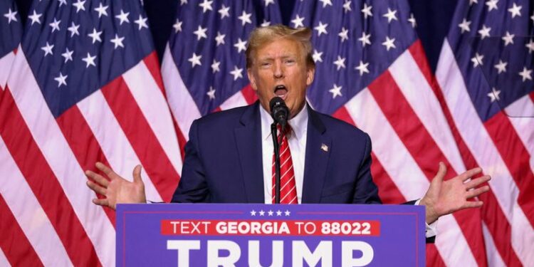 © Reuters. FILE PHOTO: Republican presidential candidate and former U.S. President Donald Trump speaks during a campaign rally at the Forum River Center in Rome, Georgia, U.S. March 9, 2024. REUTERS/Alyssa Pointer/File Photo