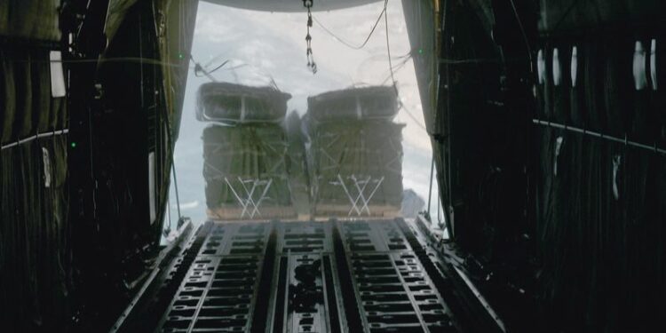 © Reuters. FILE PHOTO: A U.S. Air Force C-130J Super Hercules conducts an airdrop of humanitarian assistance over Gaza, March 2, 2024. U.S. Air Force/Handout via REUTERS/FILE PHOTO
