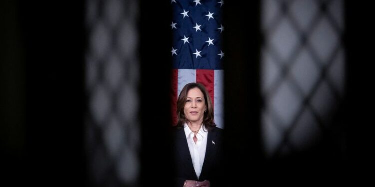 © Reuters. FILE PHOTO: U.S. Vice President Kamala Harris looks on from inside the House Chamber, ahead of U.S. President Joe Biden’s State of The Union Address on Capitol Hill in Washington, U.S., March 7, 2024. REUTERS/Tom Brenner/File photo
